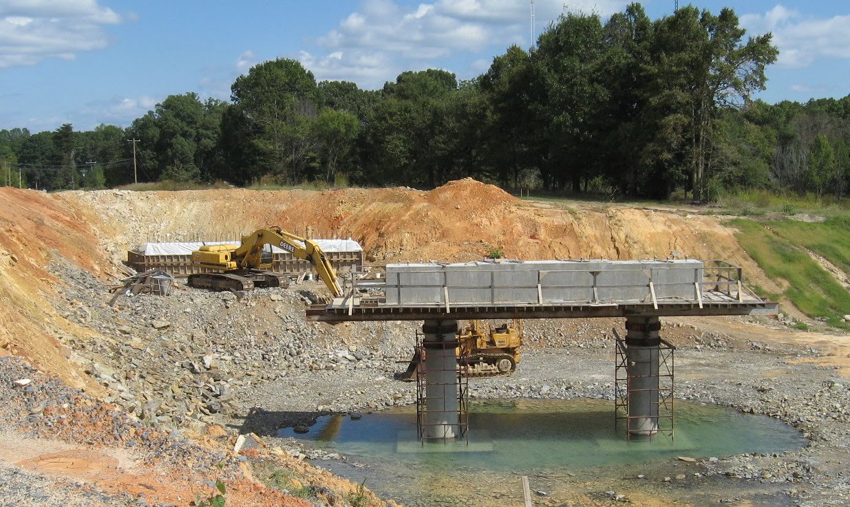 Sorry, if anyone has a sudden urge to go. Notice the disparate design elements on either side. On the east side the wall is vertical on the side and under the bridge, the side includes the wall pieces seen on many new NC bridges. To the west, the cement wall under the bridge is inclined with no element to meet the new roadway. Grading continues on the freeway toward US 220. The work seems to be mostly on the future westbound lanes: