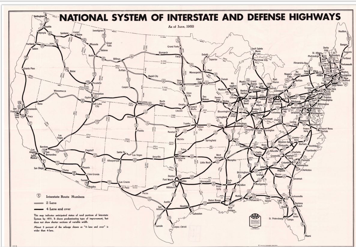 One of the more interesting finds so far is this map by the American Automobile Association (AAA) that shows the planned lane configurations of the original Interstate system. I was amazed by the amount of two lane interstates planned for 1971.