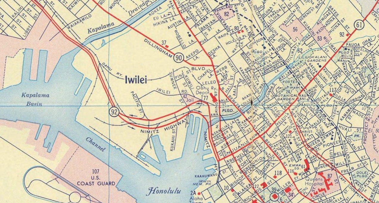 Through Naval Air Station Pearl Harbor Hawaii Route 90/Kamehameha Highway and Hawaii Route 92/Nimitz Highway notably were aligned alongside each other. Below Nimitz Highway (on the left as the two-lane highway) and Kamehameha Highway can be seen running alongside each other west of downtown Honolulu in a Hawaii Department of Transportation photo from 1951 (courtesy hawaiihighways.com).