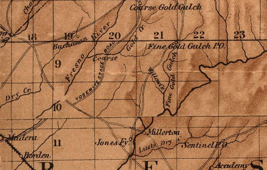 The Yosemite Stage Road can be seen connecting the Fresno Big Trees (Mariposa Grove) to Madera on the 1882 Bancroft's Map of California. The original Yosemite Stage Road passed through Fresno Flats (modern Oakhurst) and Coarsegold as it descended through the Sierra Nevada Mountains following much of the eastern bank of the Fresno River towards Madera. Much of this early iteration of the Yosemite Stage Road is now part of Road 400.