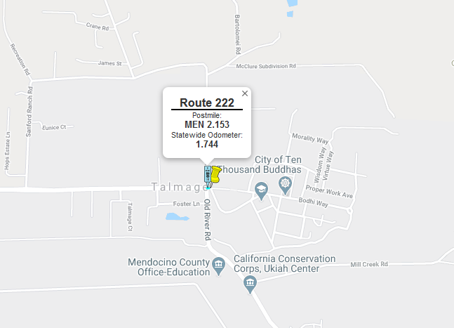 California State Route 222 ("CA 222") is a two mile State Highway which connects from US Route 101/Redwood Highway in Ukiah east via Talmage Road to the community of Talmage. CA 222 notably isn't signed with reassurance shields but does include Post Mile paddles. CA 222 has a surprisingly long history which is rooted in serving Mendocino State Hospital.